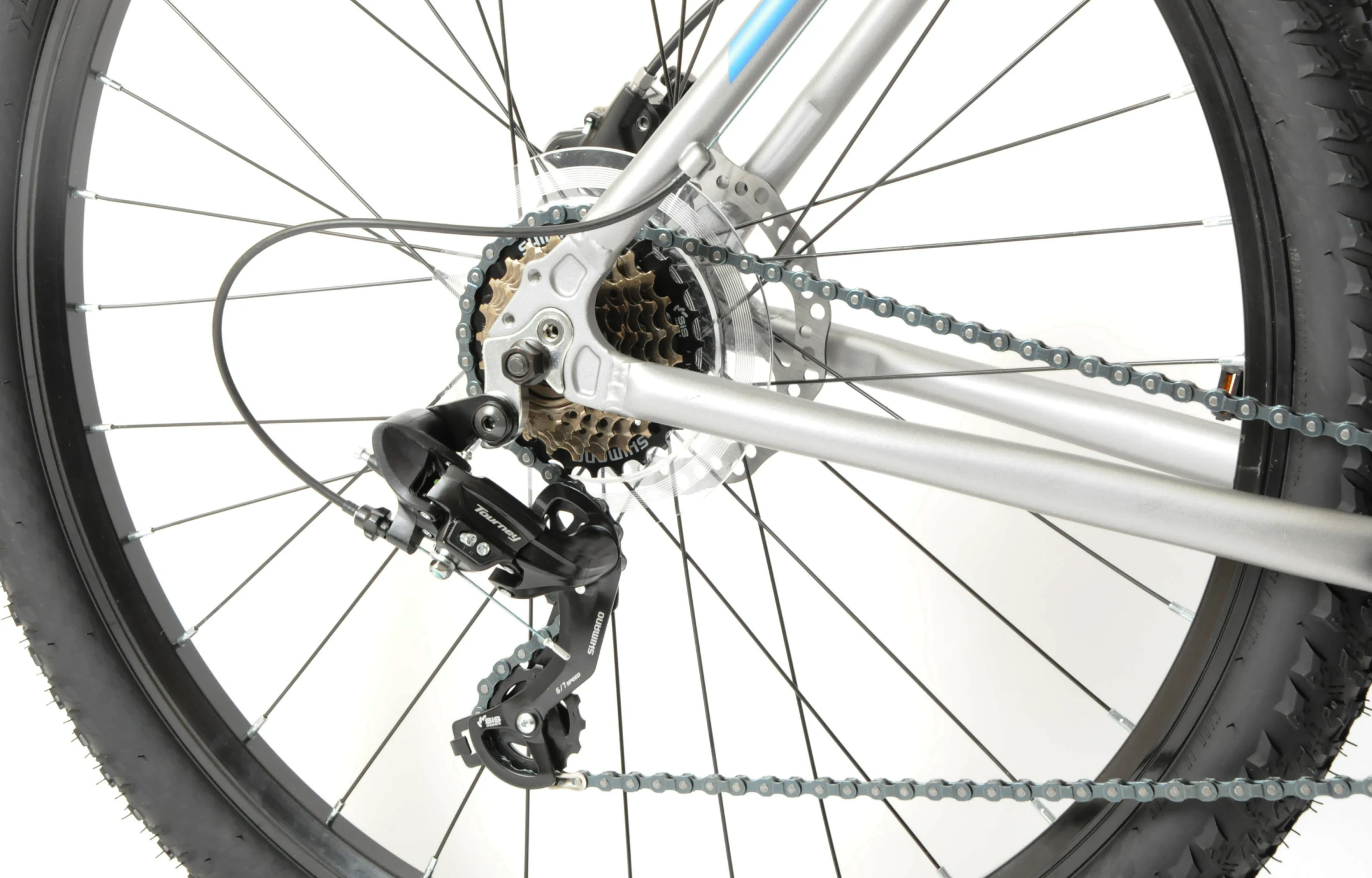 A range of 21 gears gives you enough to cover all terrains and inclines whilst the MTB tyres fitted will give you all the grip you need on both the road and trails.