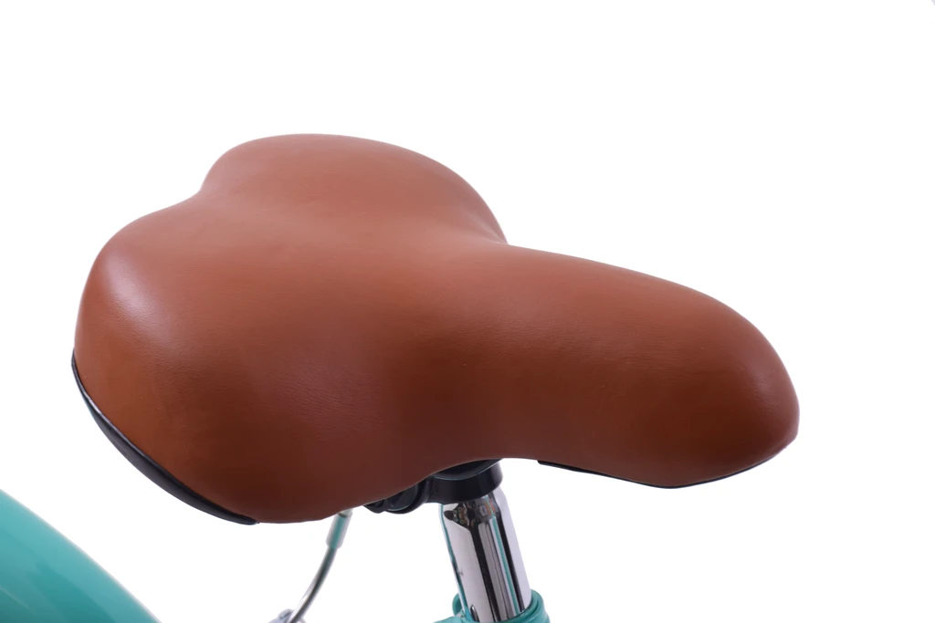 Built on a steel heritage style frame with sweeping ‘low-step’ top tube to make hopping on and off ease and assisting with keeping your child looking ahead. A padded brown junior sprung saddle takes away those bumps for a smoother ride and white non-slip pedals keeps your child’s feet safely in position.