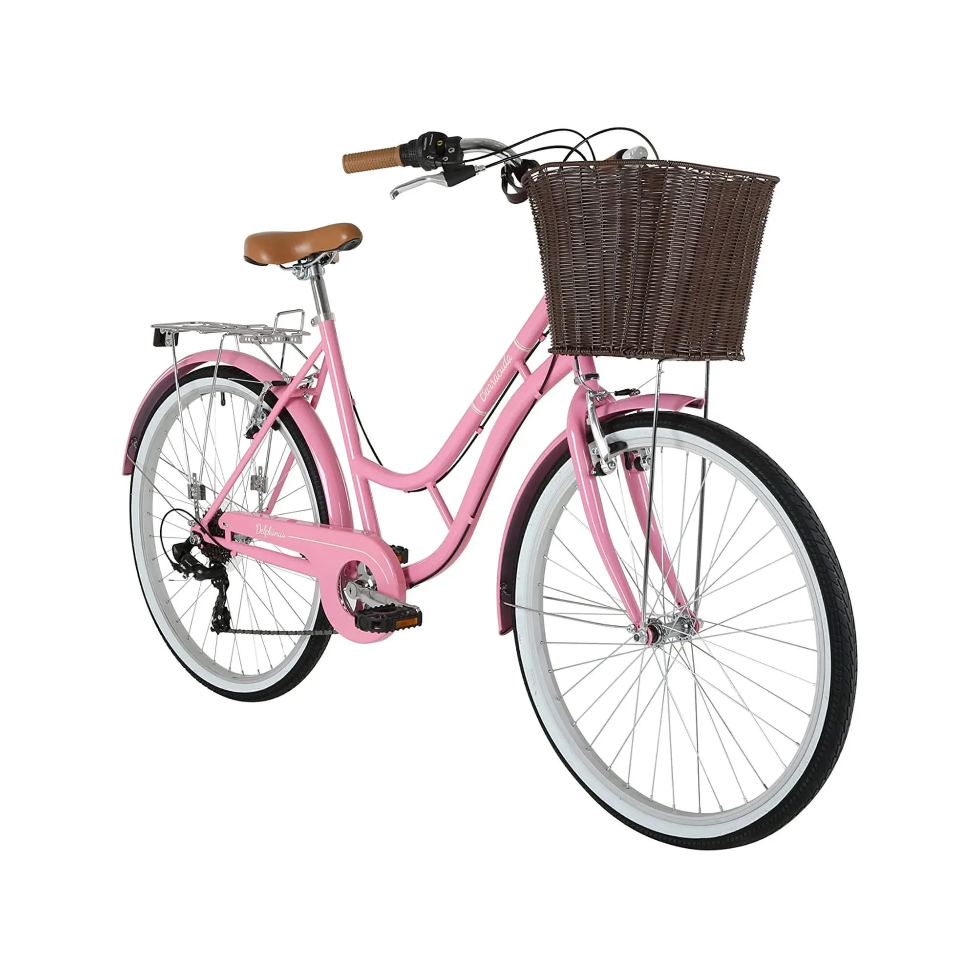 TheBarracuda Delphinus Ladies 7-Speed Lifestyle Bikeis designed to be comfortable while looking great. Its features include low step-through frame, extra-comfort saddle and grips, high-rise sweep back handlebars, full mudguards, full chainguard, Rear rack and plastic wicker front basket. This city bike comes fully equipped for your utmost convenience.
