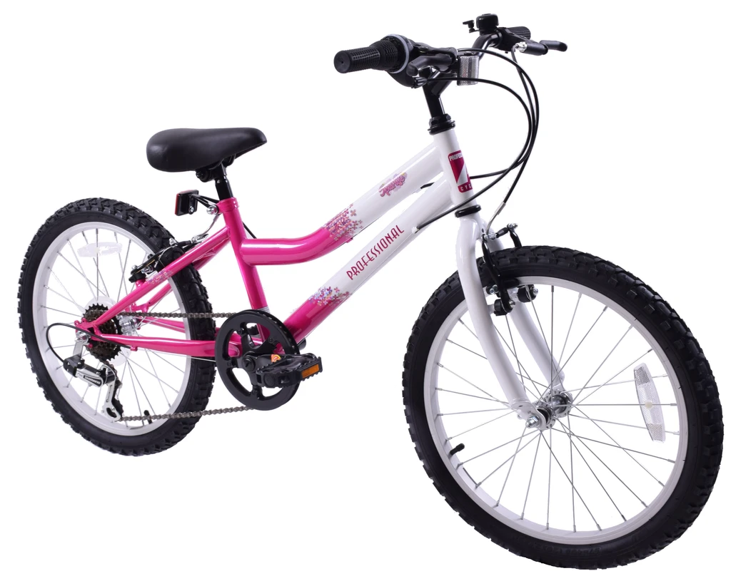 With a robust hi-tensile steel frame and forks, powerful front and rear v-type brakes to be sure you stop in your tracks. This version is the 6 speed equipped with microshift gripshift levers ideal for your child who is progressing from a single speed bike. Equipped with 20″ x 2.125″ MTB tyres for on or off road riding and topped off at just 11.8kgs! Perfect girly “sparkle” gloss pink & white shiny finish be sure she will love!
